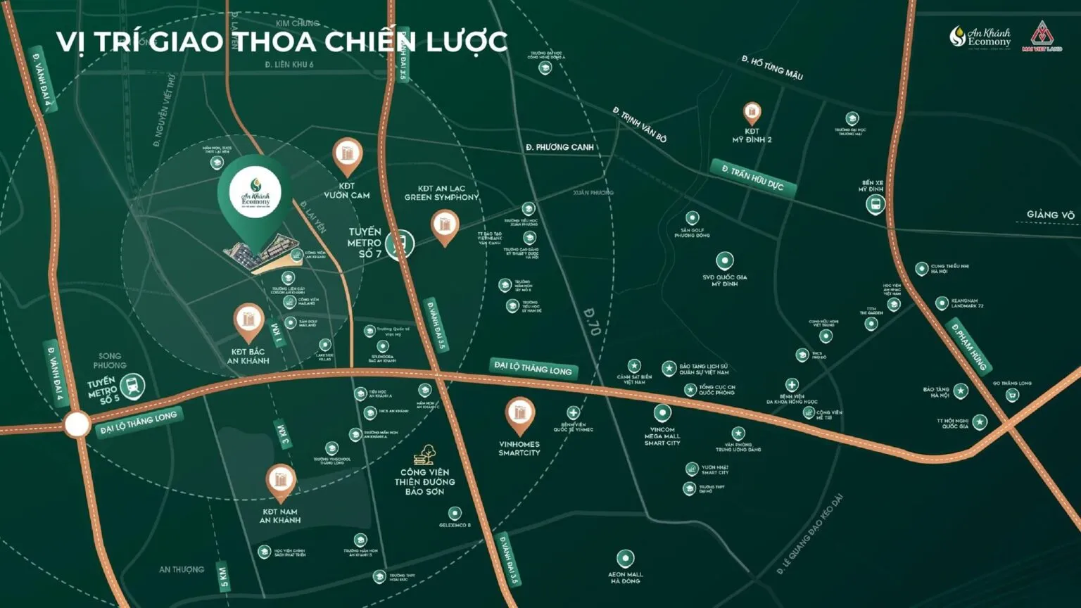An Khánh Ecomony nằm ở phía Tây Hà Nội, toạ lạc ngay giao lộ của Đại lộ Thăng Long và đường vành đai 3,5, dự án được hưởng đặc quyền “không tắc đường” hiếm có nhờ sự quy hoạch thông thoáng và bài bản. Đặc biệt đại lộ Thăng Long mới được mở rộng làn đường nên đường rộng đi lại vô cùng thông thoáng.