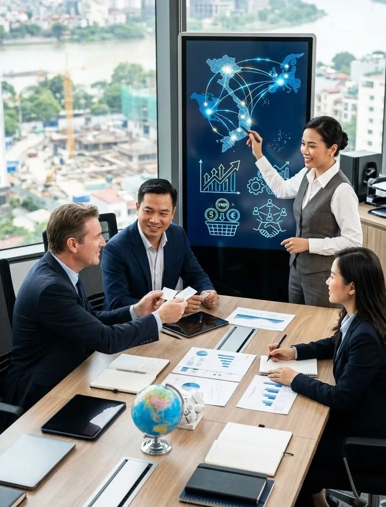 Tầm nhìnTrở thành đơn vị uy tín hàng đầu trong lĩnh vực xúc tiến đầu tư, tư vấn chiến lược và kết nối hợp tác kinh doanh, đóng vai trò cầu nối tin cậy giữa các doanh nghiệp, nhà đầu tư và đối tác trong nước cũng như quốc tế. Sứ mệnh